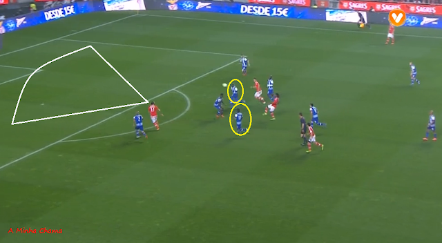 Esta foi a pressão dos jogadores do Benfica que resultou na obtenção do primeiro golo. Induzir o adversário ao erro! Pode ou não acontecer mas obrigar o adversário a sair com um pontapé do guarda redes, dá mais probabilidade de a nossa defesa anular as jogadas de ataque...