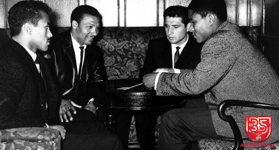 Uma suecada entre Santana, Coluna, Cruz e Eusébio algures em Londres em 1962.