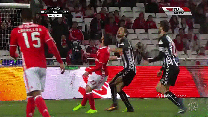 Mais uma entrada a matar, Salvio deixou de jogar depois disto... Foi perceptível a cara de rui correia que soube de imediato a sorte que teve em ter atingido um jogador do Benfica... É evidente que os árbitros portugueses estão coagidos a não mostrar cartões vermelhos a jogadores adversários do Benfica - independentemente do que aconteça! Talvez seja necessário alguém partir uma perna ou morrer em campo, como - e sei que posso estar a exagerar - poderia ter acontecido neste lance perto dos 90 minutos.