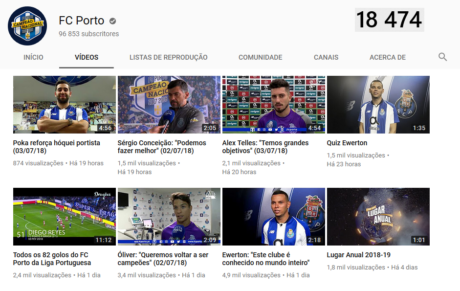 Estes são os últimos 8 vídeos publicados pelo canal do Benfica, pelo do porto-clube e pelo canal deste blogue. à direita, no topo, está a respectiva soma de visualizações.